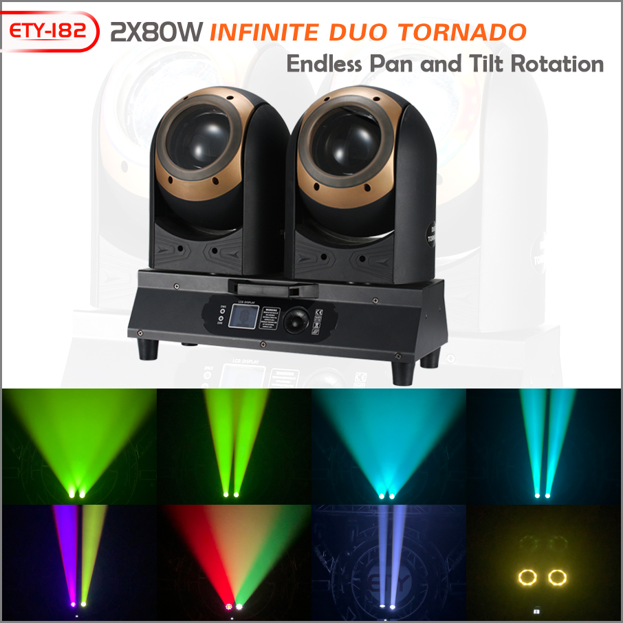 2个独立灯头,每个灯头均配备LED光圈,可无限XY轴旋转,颜色、光圈颜色可单独控制